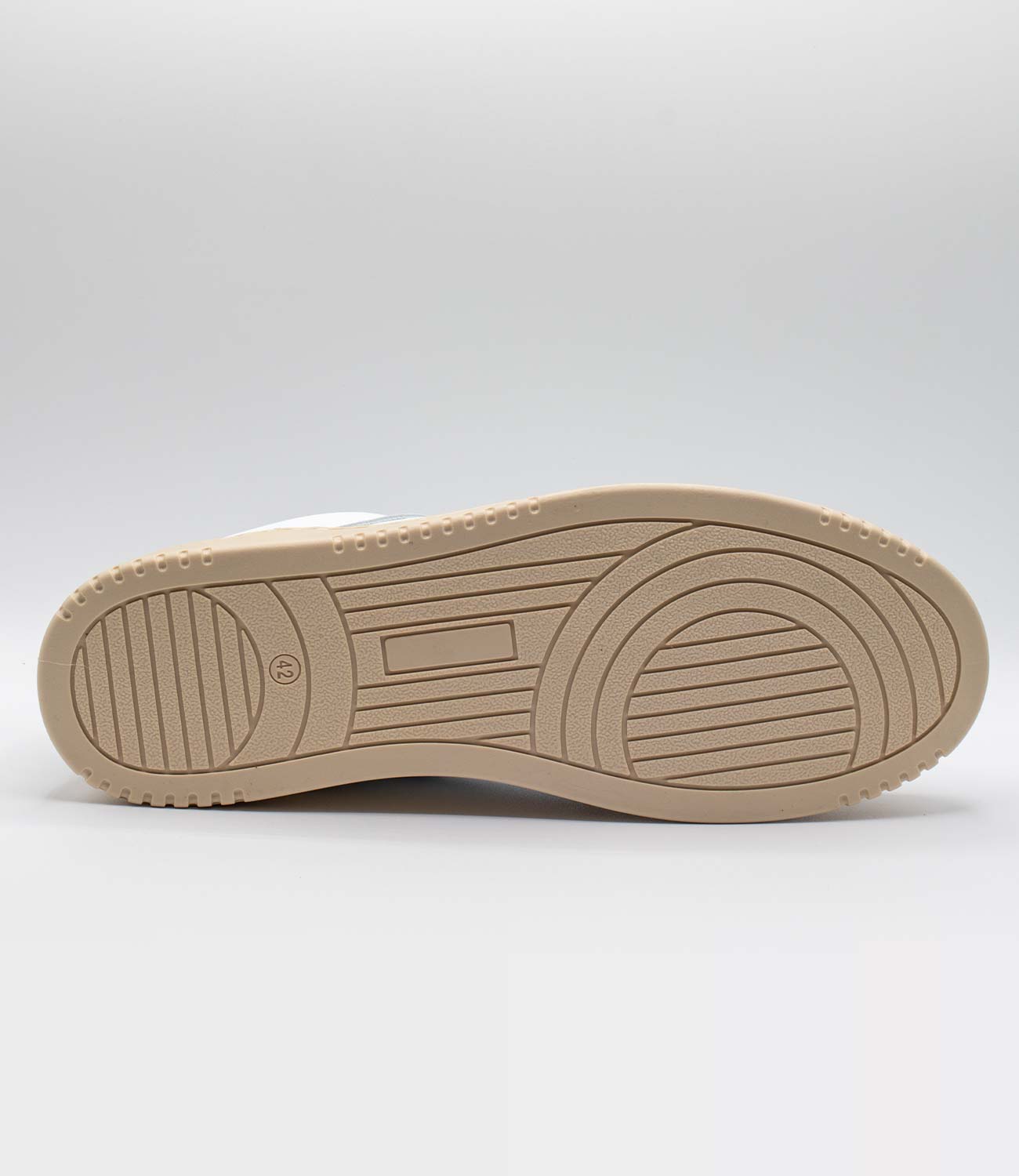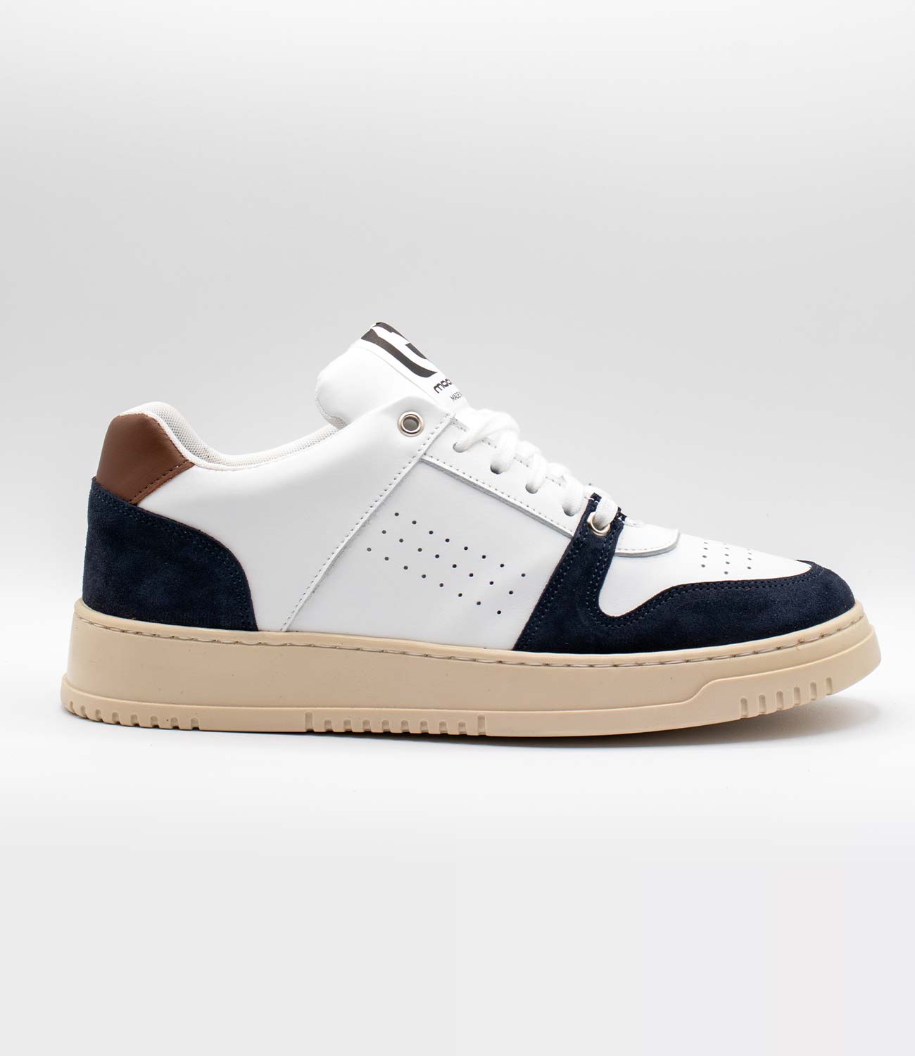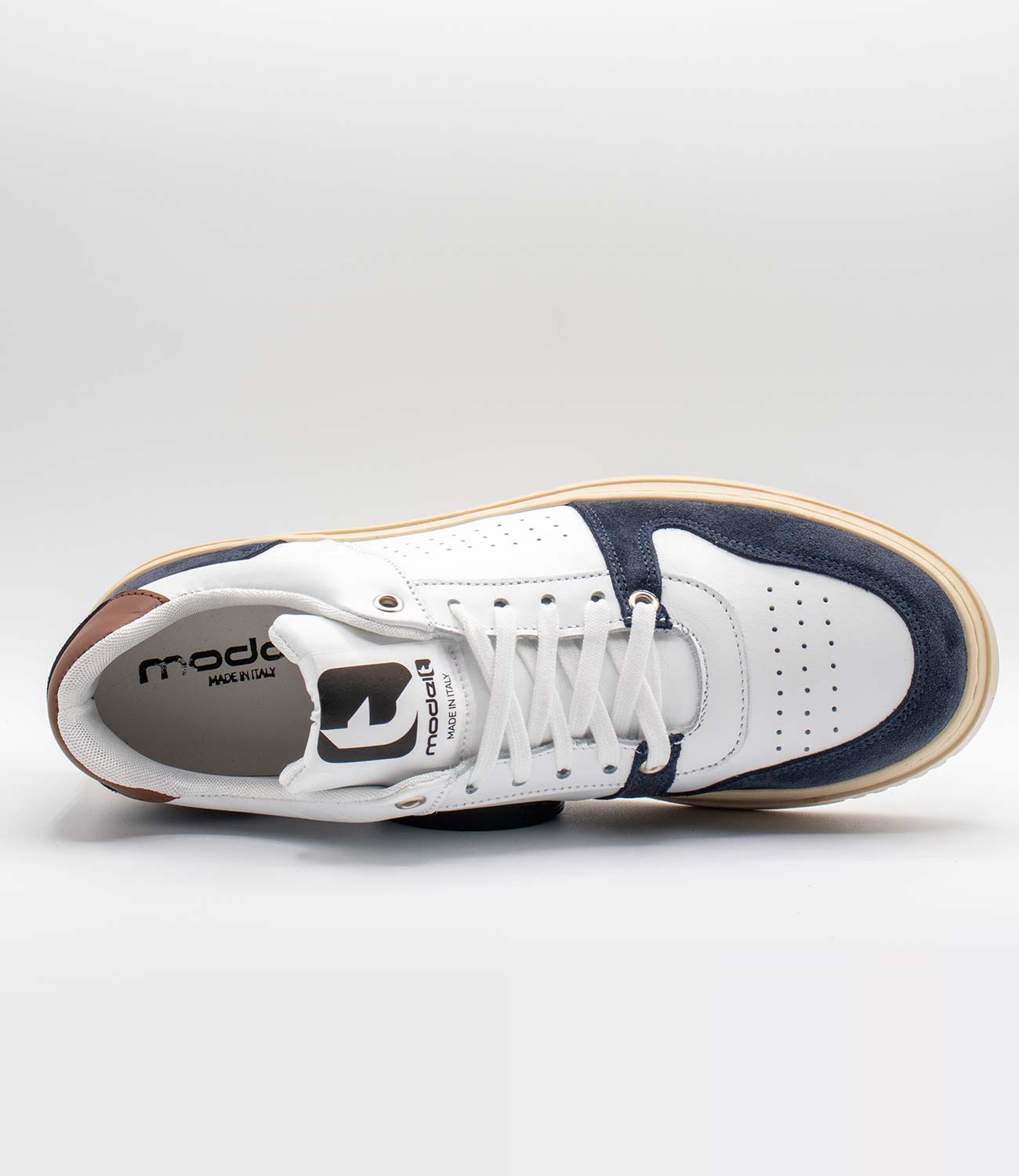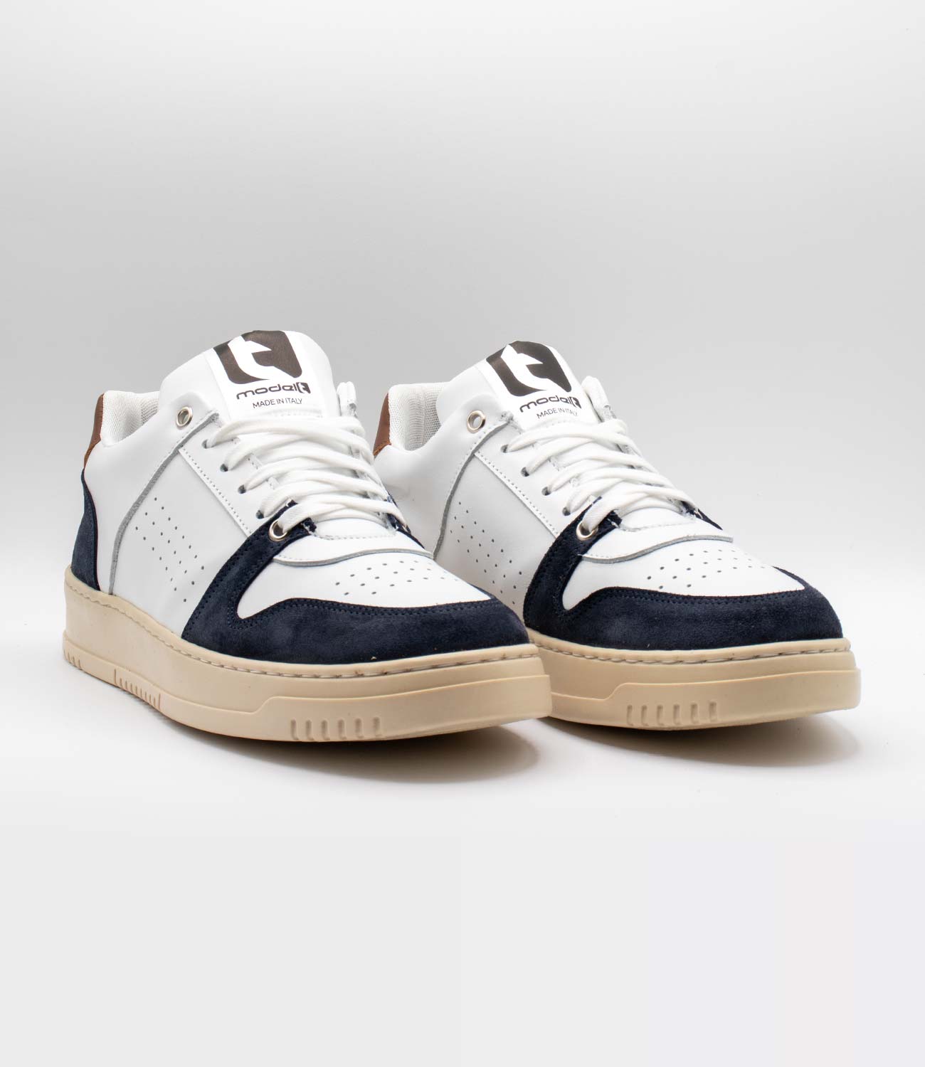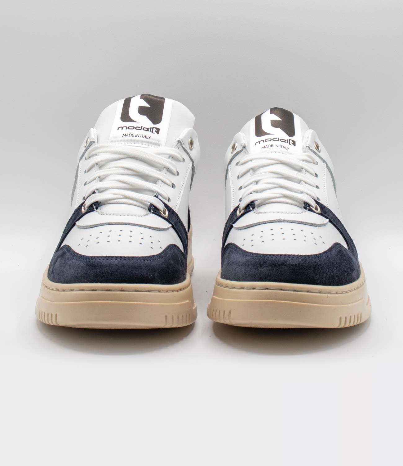 Sneakers in vera pelle. Tomaia in morbida pelle bianca con inserti in camoscio Blu sulla punta e sul calcagno e pelle cuoio sullo spoiler . Soletta anatomica e suola in morbida gomma ultraleggera, l'interno è in micro fibra ad alta traspirazione, laccio tecnico bicolore. Prodotto 100% made in Italy interamente fatte a mano dai nostri artigiani calzaturieri.
