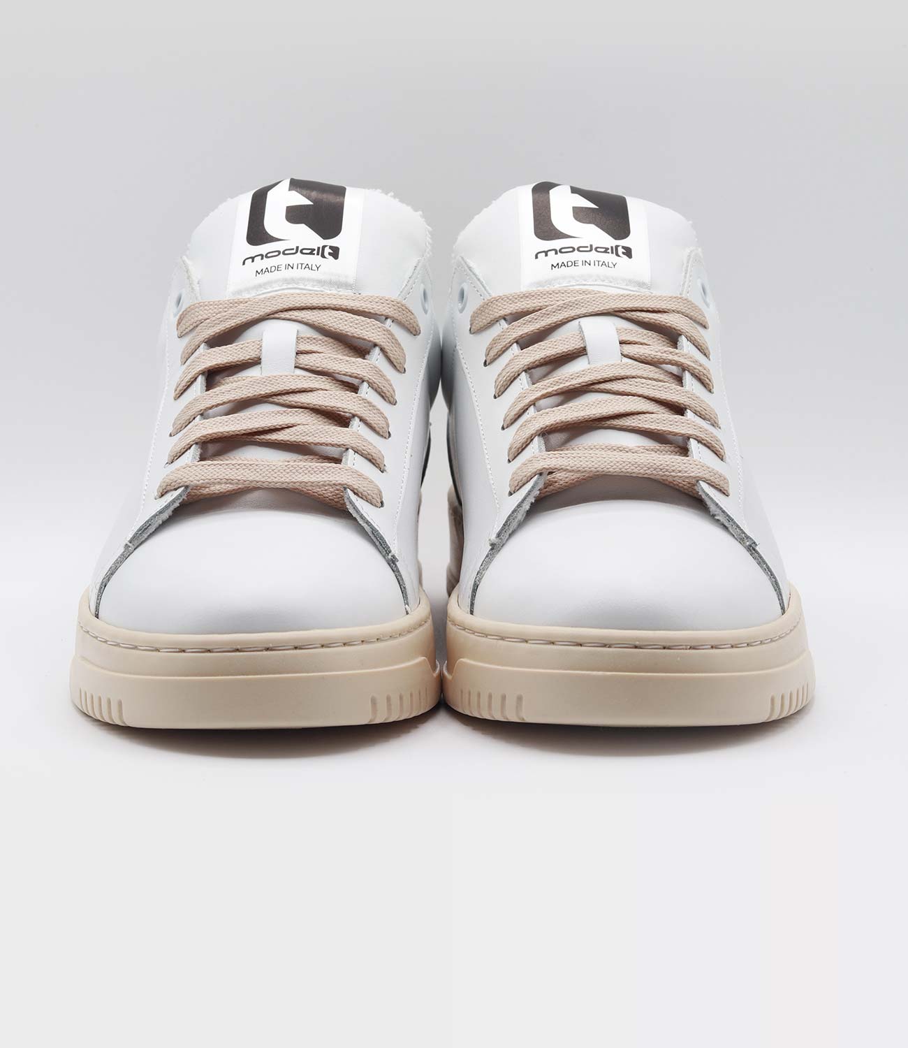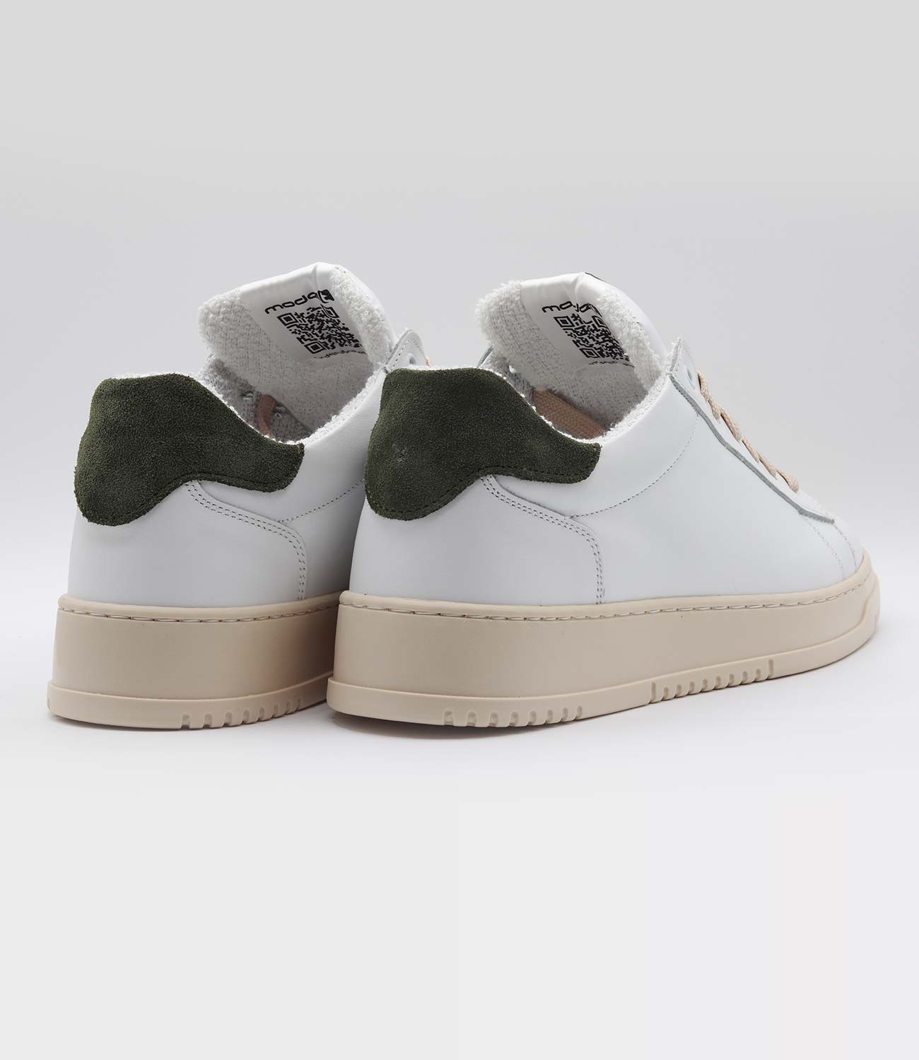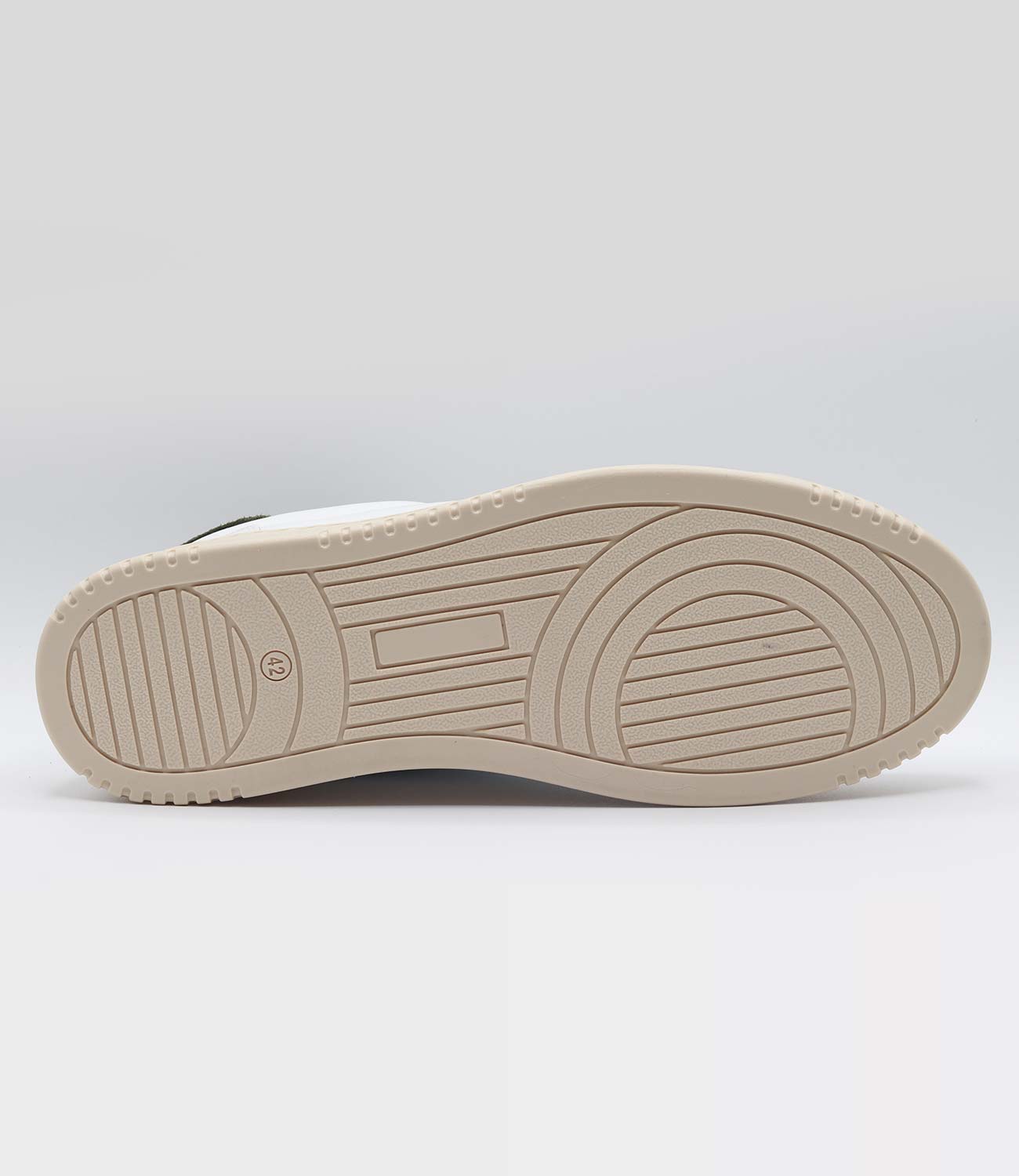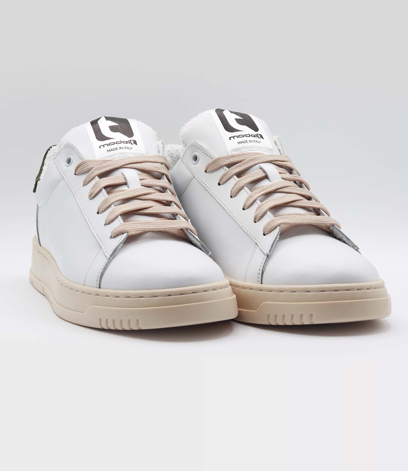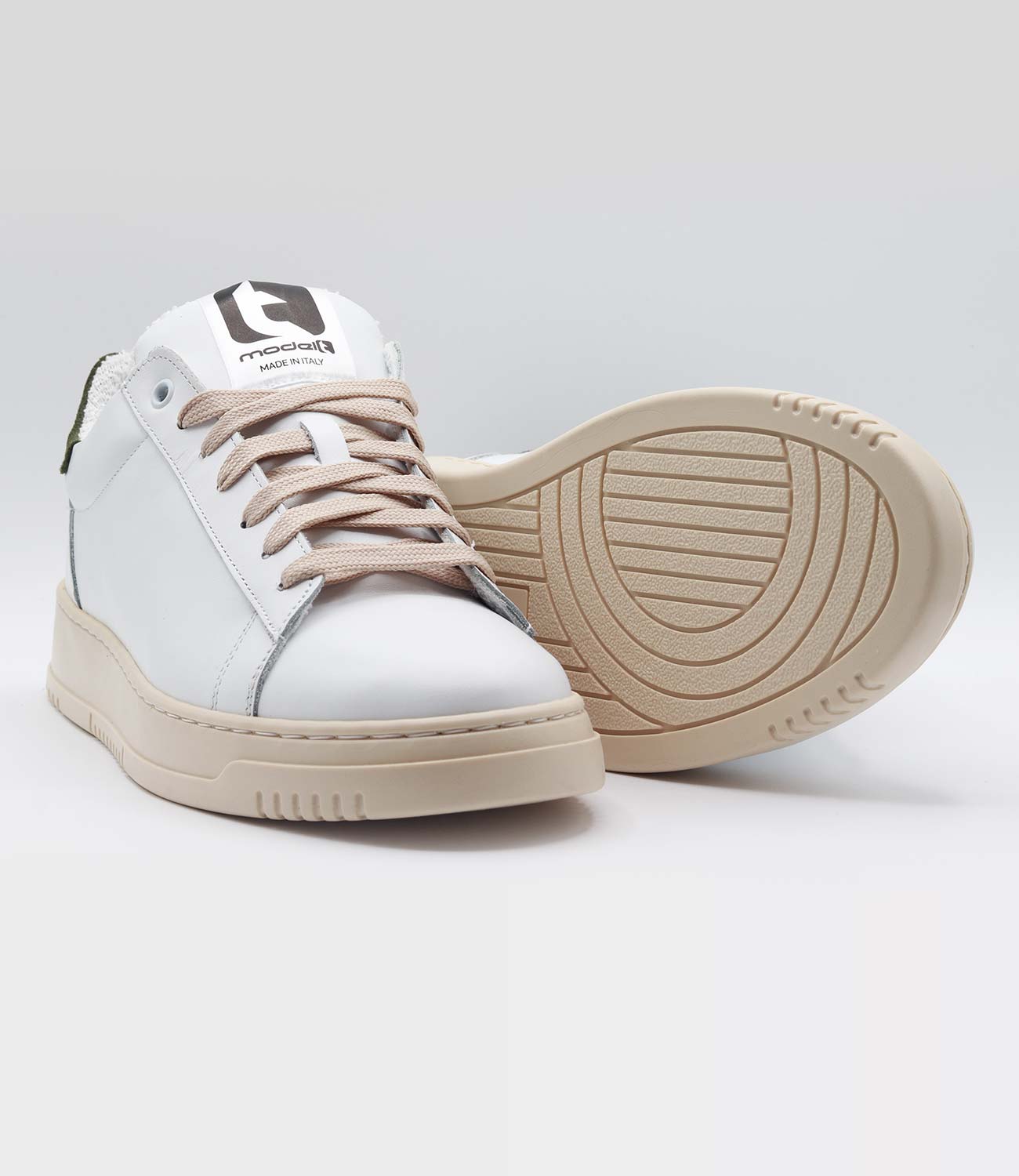 Scarpe da ginnastica in vera pelle. Tomaia in morbida pelle bianca con inserto in camoscio verde. Soletta anatomica e suola in morbida gomma ultraleggera, l'interno è in cotone traspirante ,donando al piede un confort senza eguali. Prodotto 100% made in Italy interamente fatte a mano dai nostri artigiani calzaturieri.