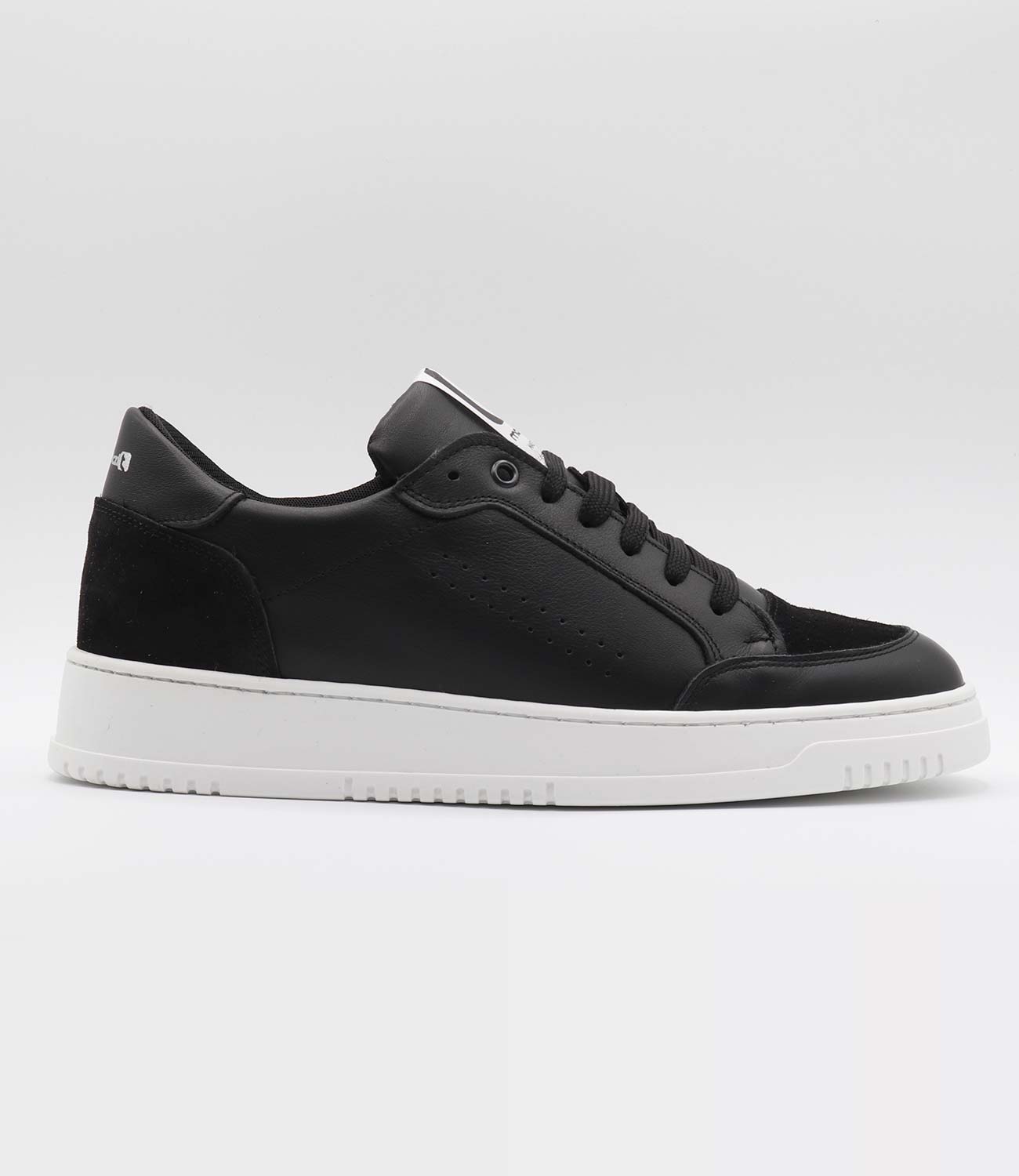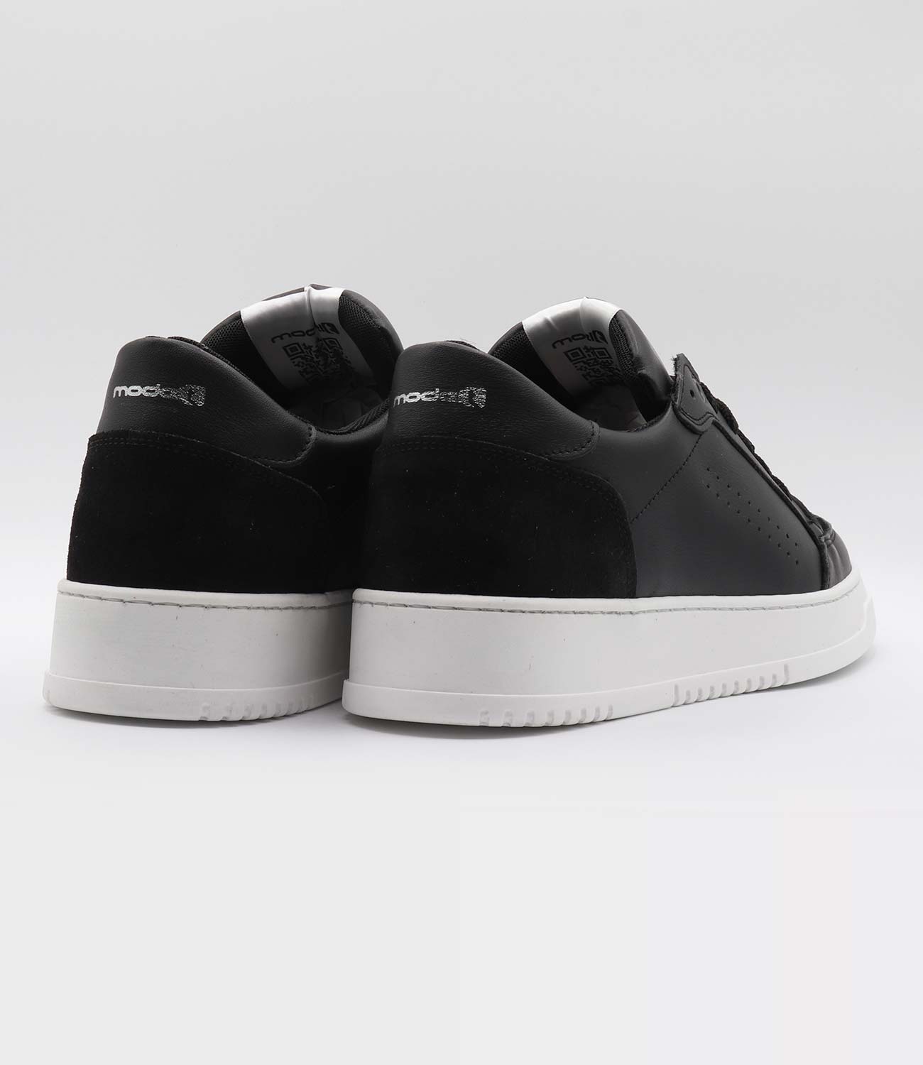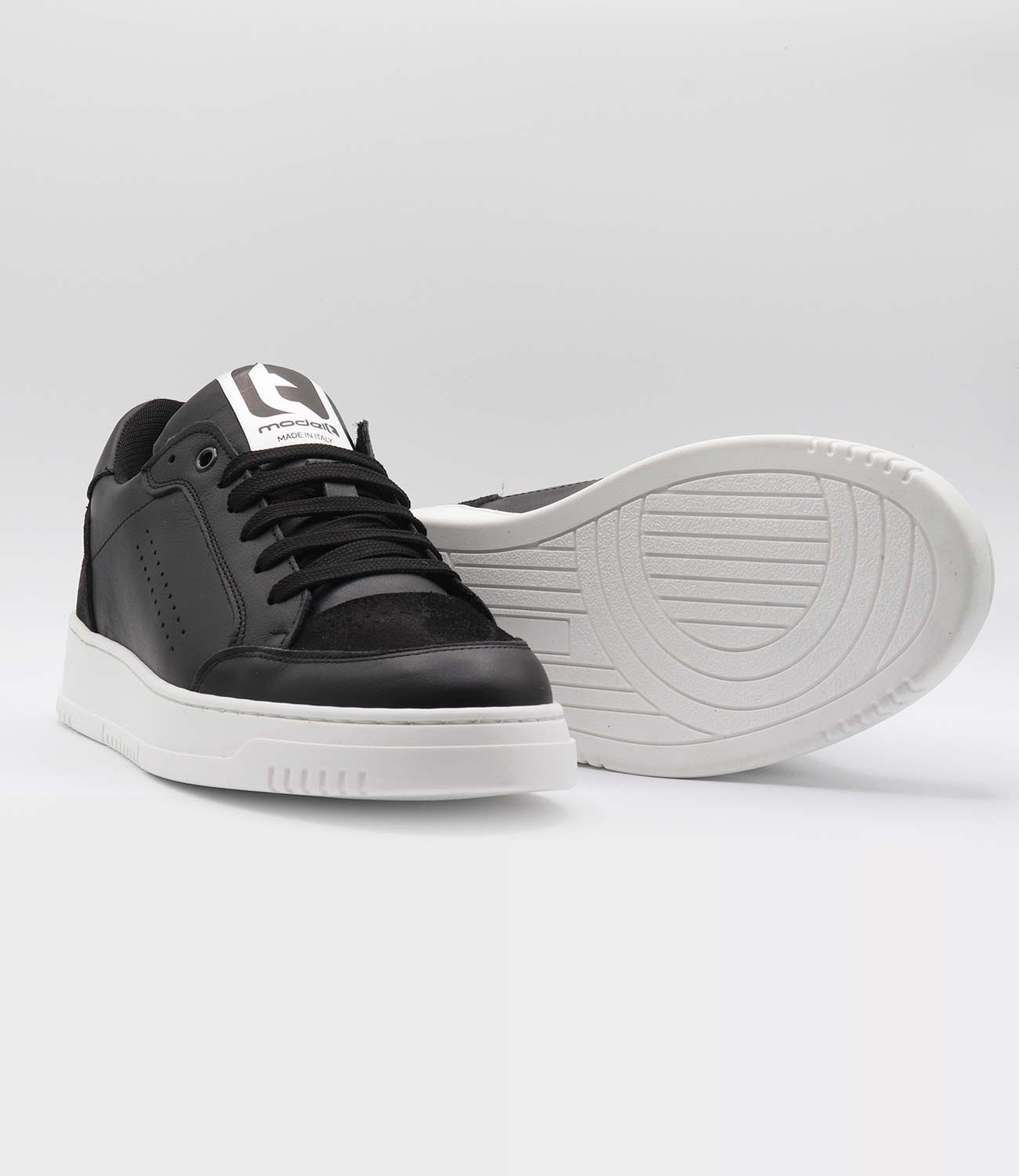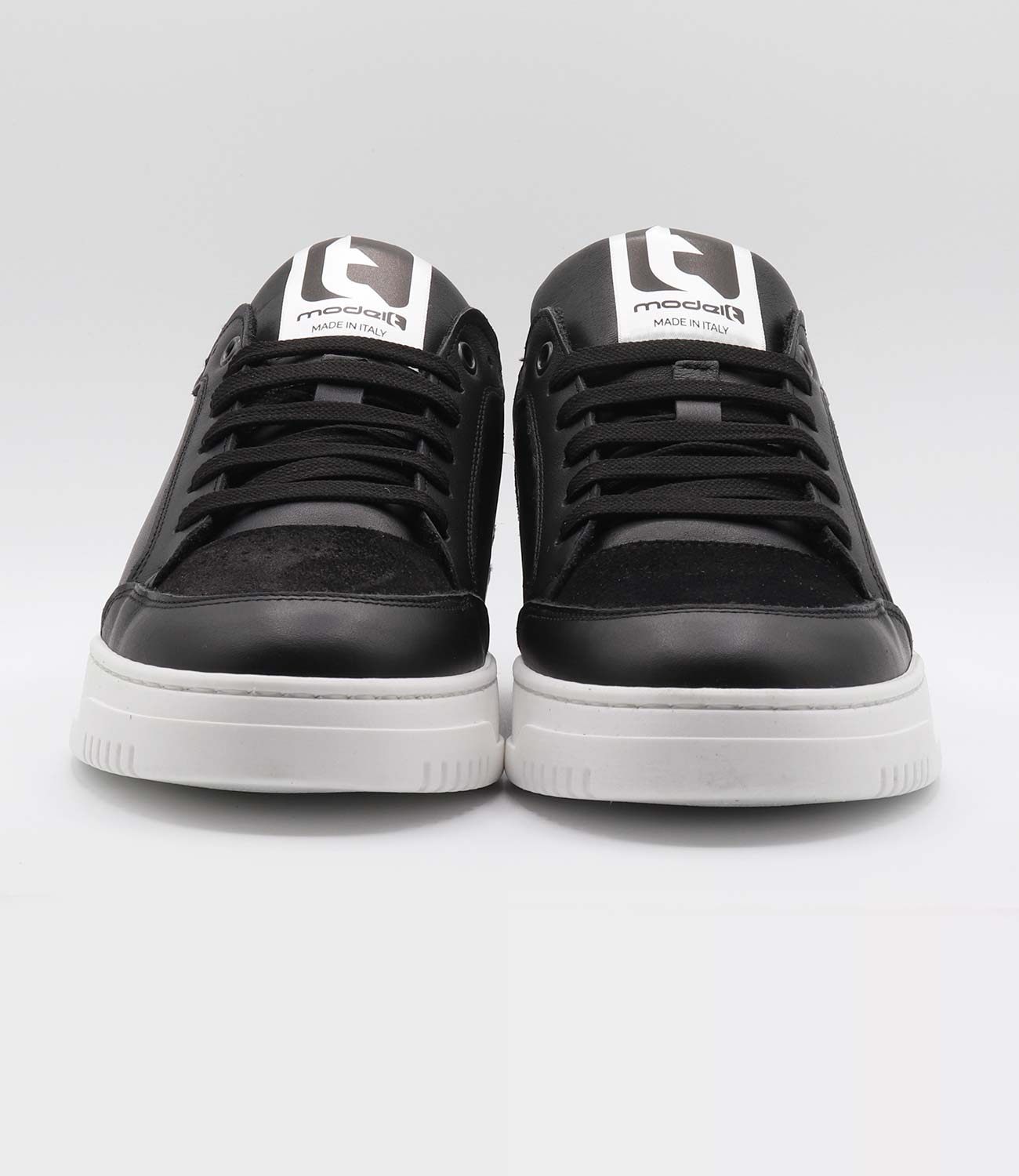 Sneakers in vera pelle. Tomaia in morbida pelle nera, con inserti in camoscio nero sulla punta e sul calcagno. Soletta anatomica e suola in morbida gomma ultraleggera, l'interno è in micro fibra ad alta traspirazione, laccio tecnico bicolore. Prodotto 100% made in Italy interamente fatte a mano dai nostri artigiani calzaturieri.