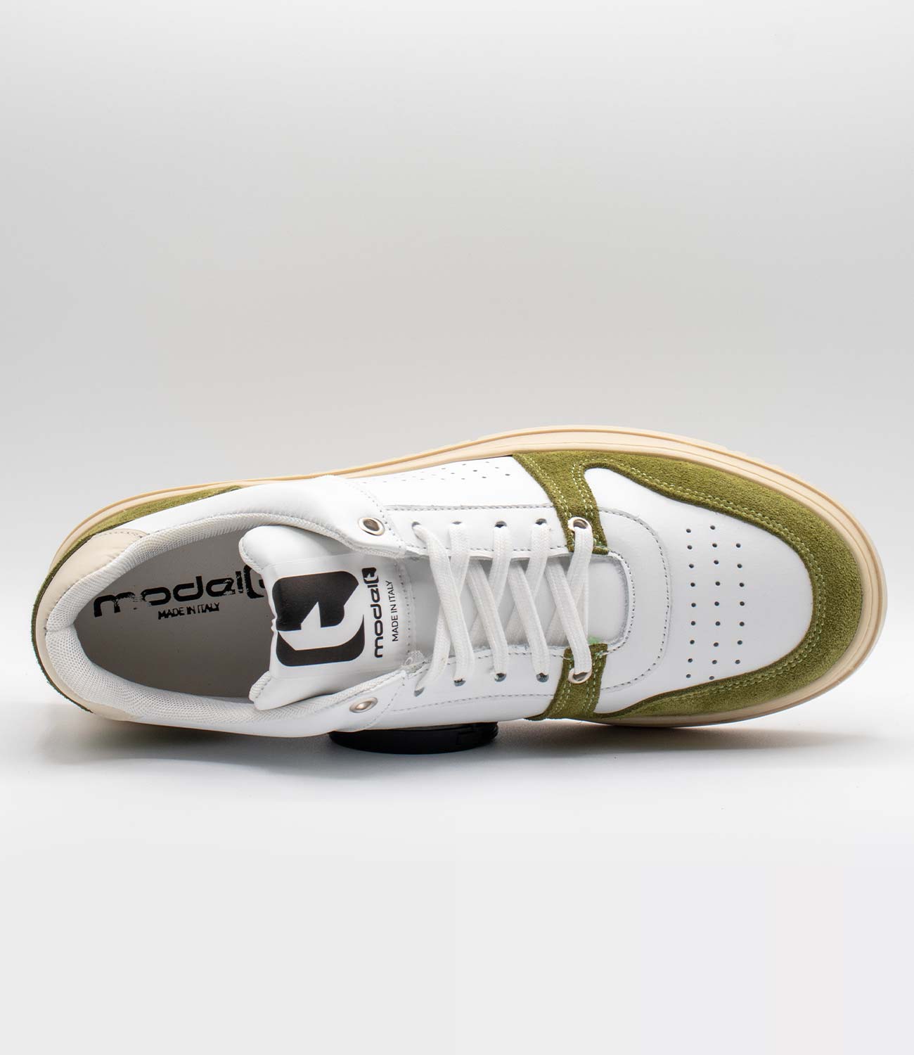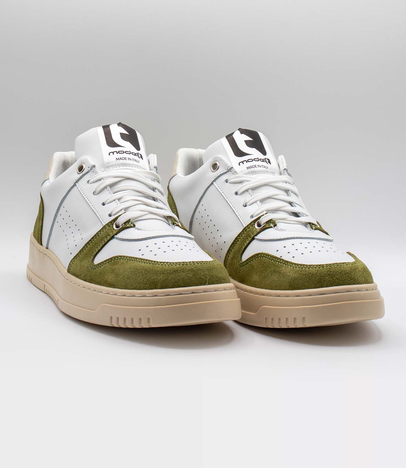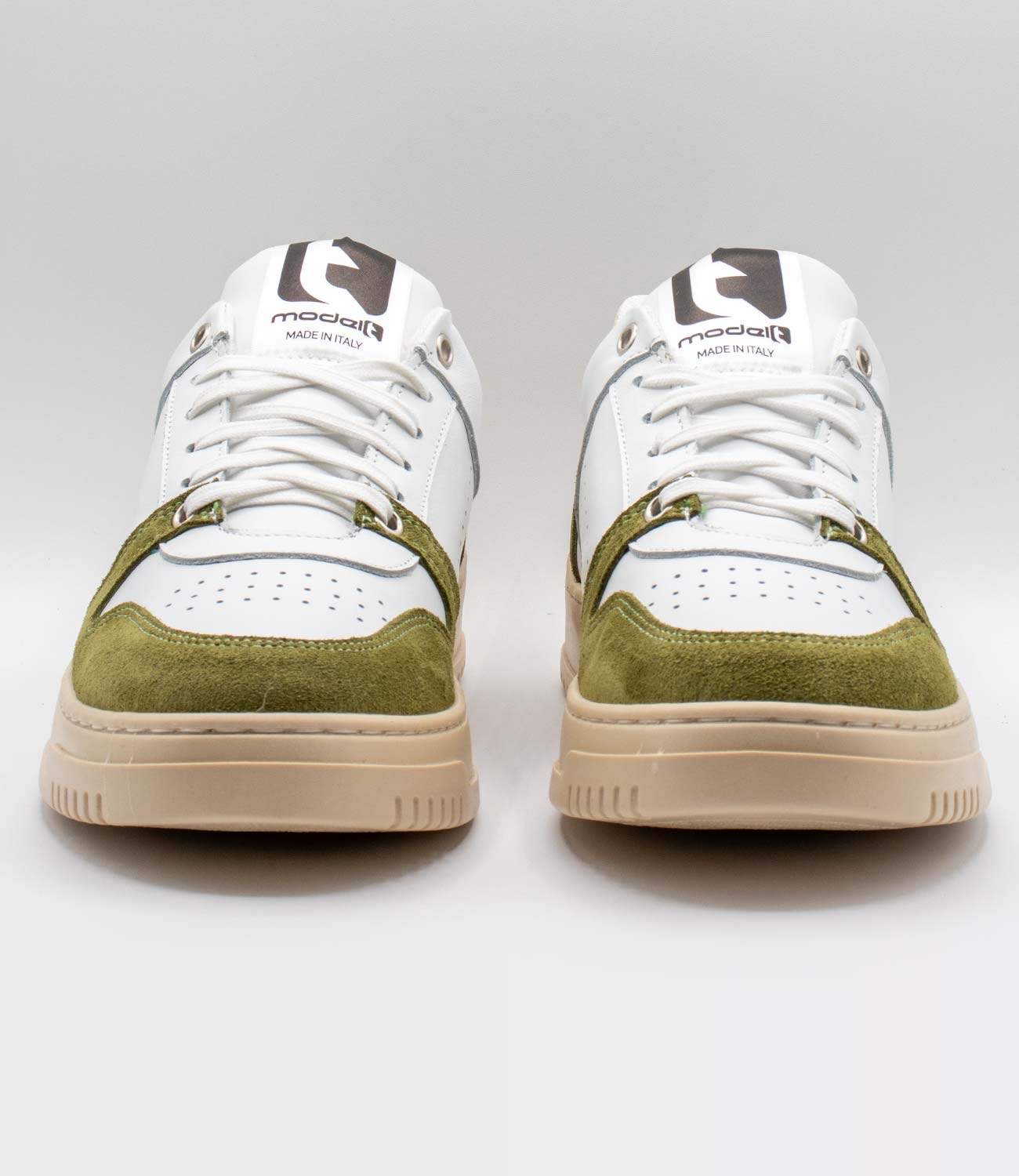 Sneakers in vera pelle. Tomaia in morbida pelle bianca con inserti in camoscio Verde sulla punta e sul calcagno e pelle beige sullo spoiler . Soletta anatomica e suola in morbida gomma ultraleggera, l'interno è in micro fibra ad alta traspirazione, laccio tecnico bicolore. Prodotto 100% made in Italy interamente fatte a mano dai nostri artigiani calzaturieri.
