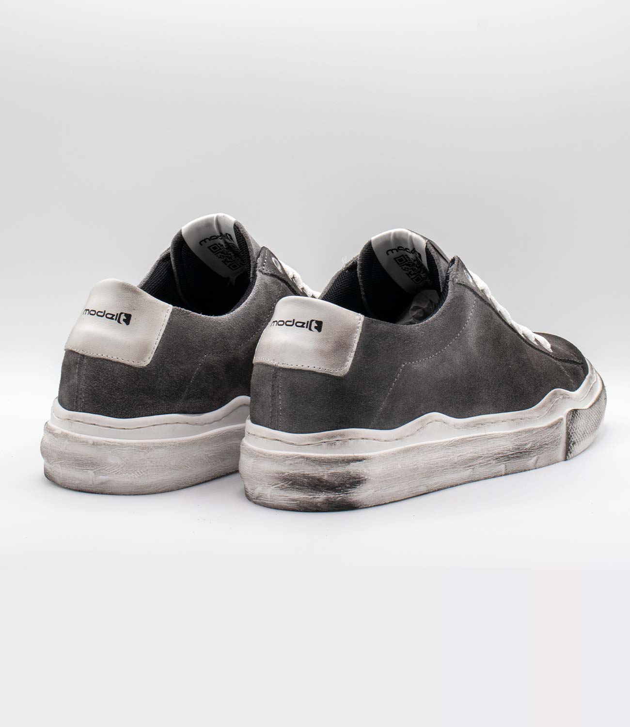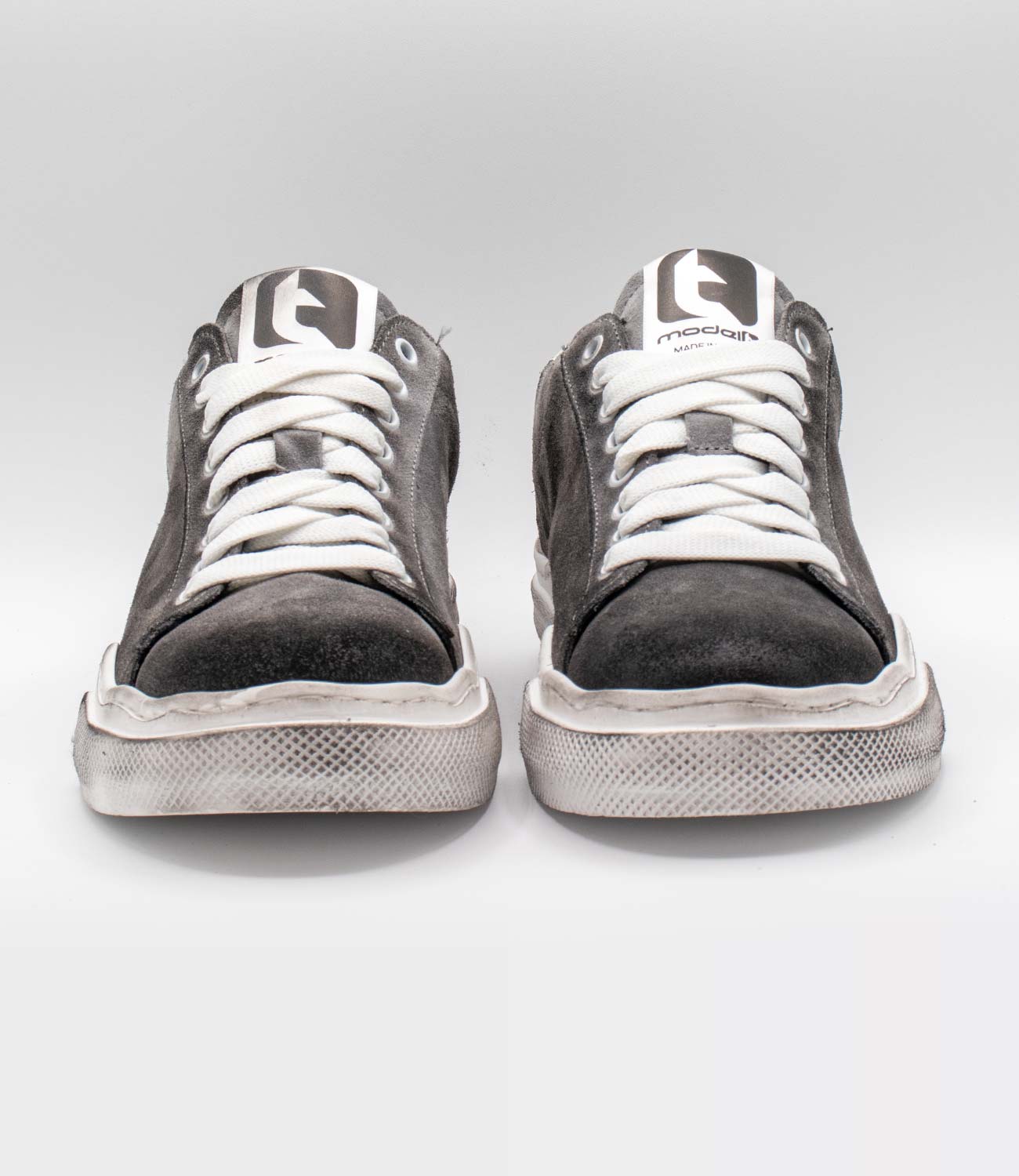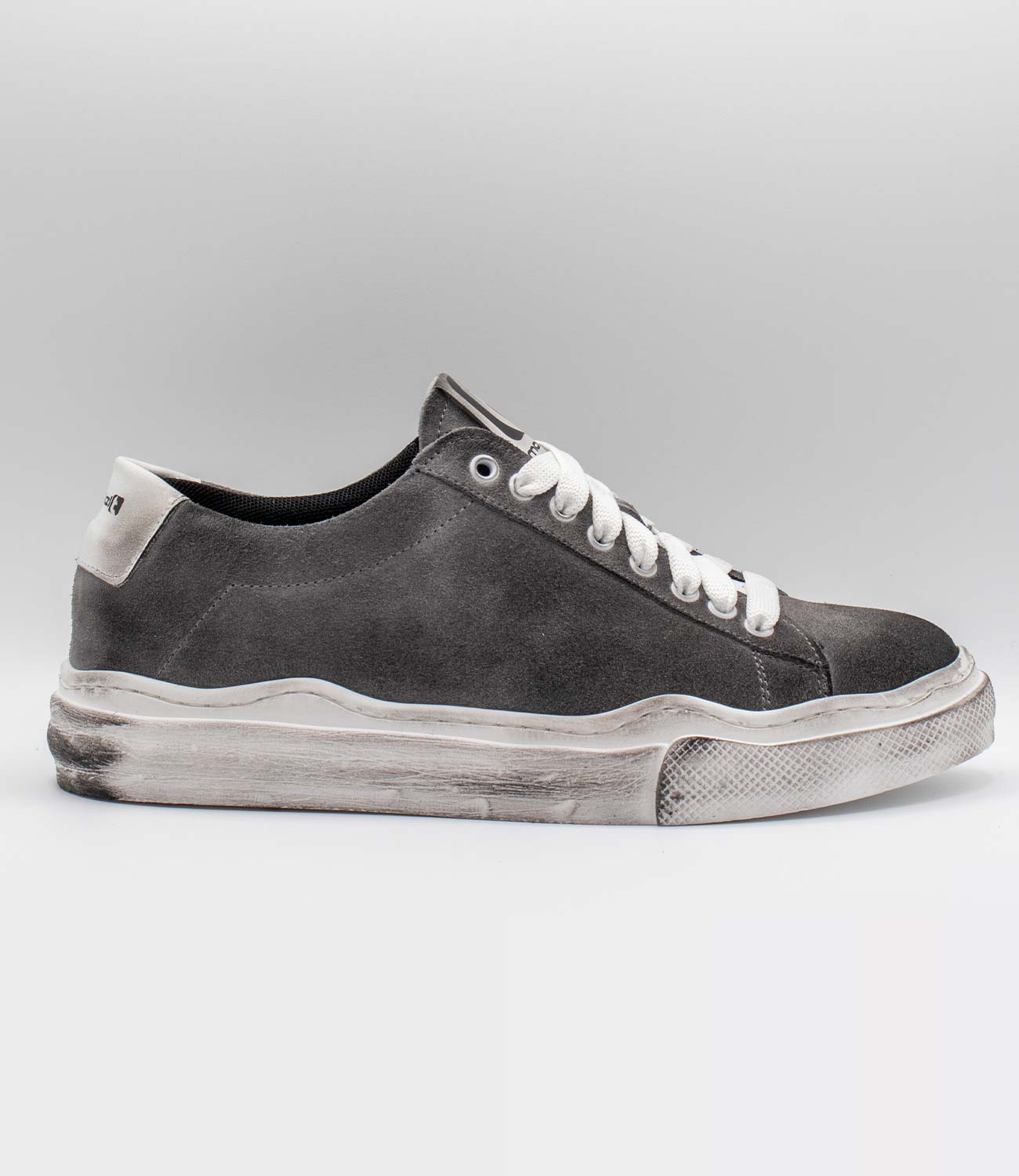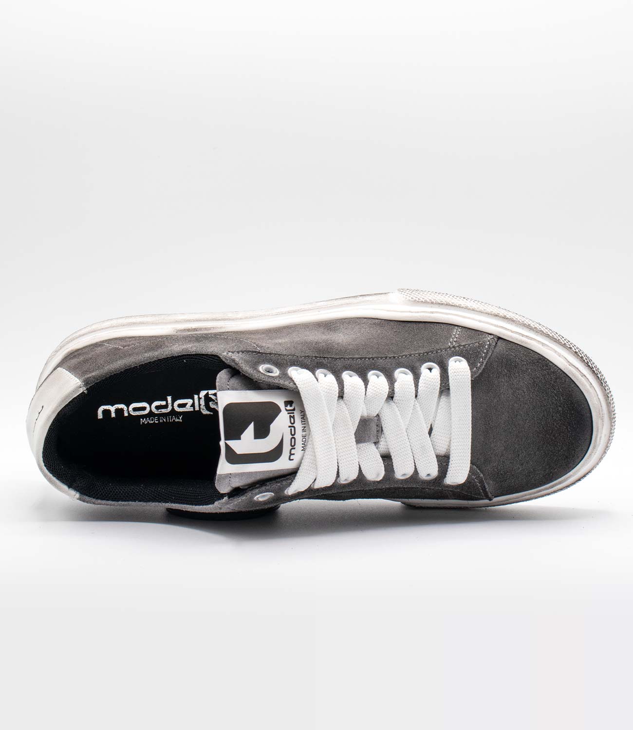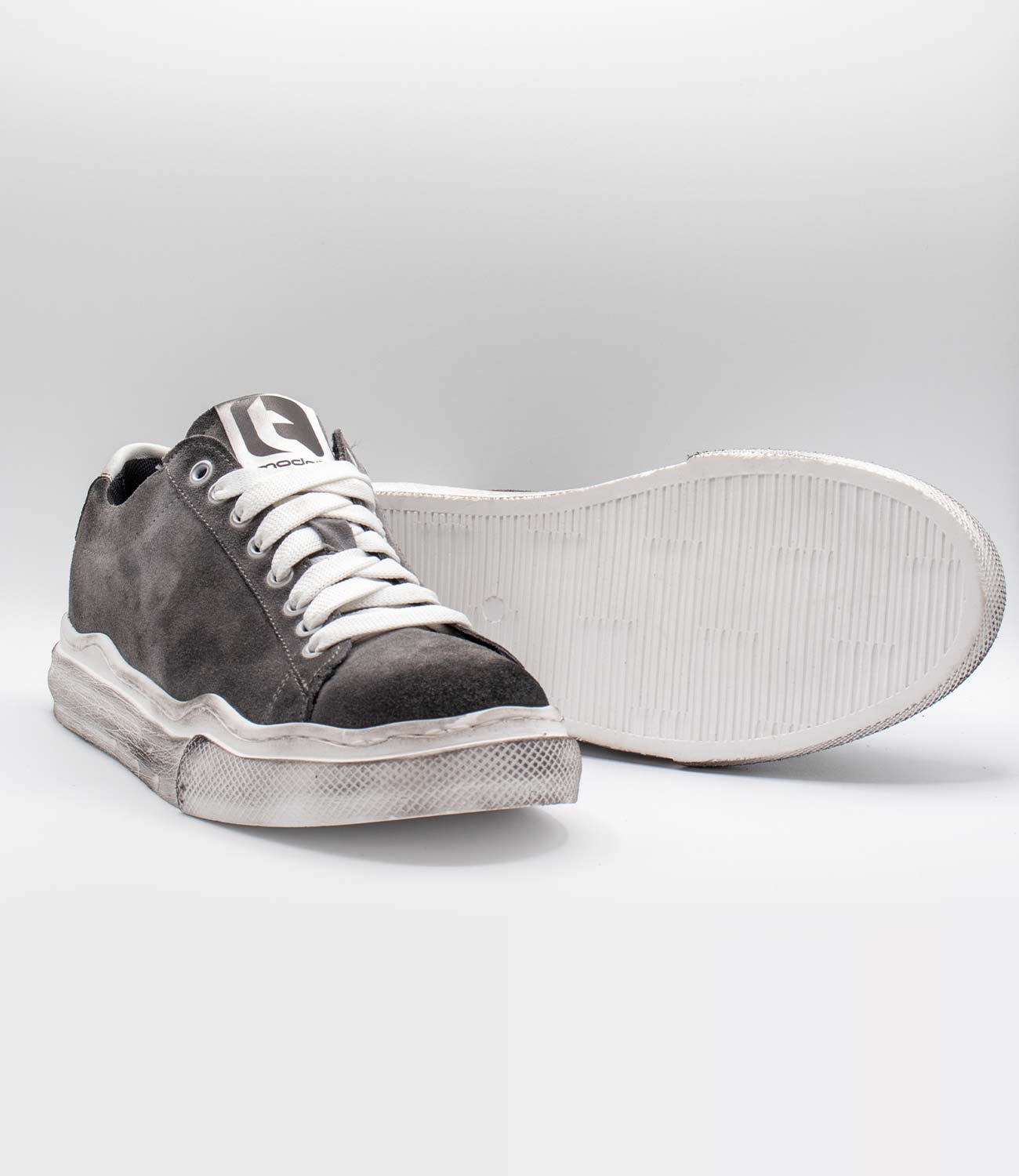 Sneakers in vera pelle. Tomaia in camoscio liscio colore grigio con inserto in pelle bianca sullo spoiler , soletta anatomica e gomma bicolore morbida ultraleggera con laccio tecnico bicolore l'intento in morbido cotone traspirante. Prodotto 100% made in Italy interamente fatte dai nostri artigiani calzaturieri.