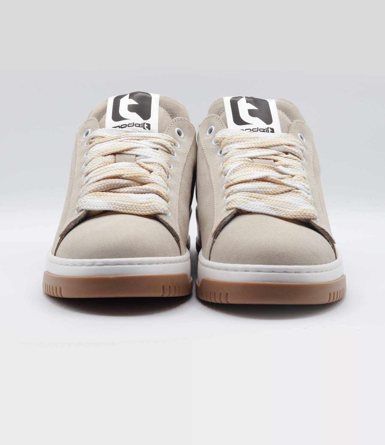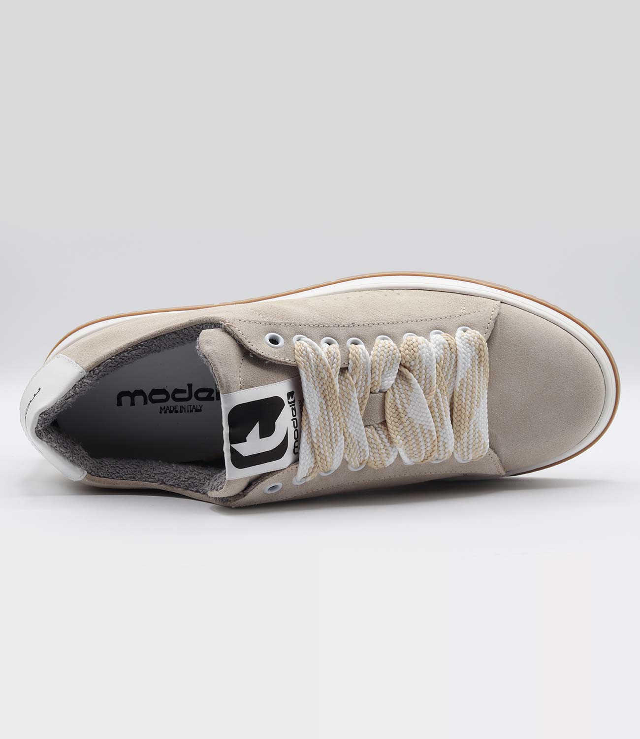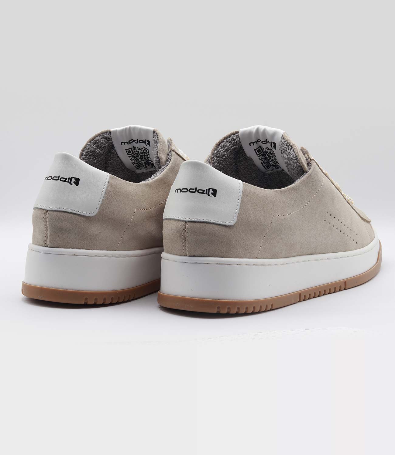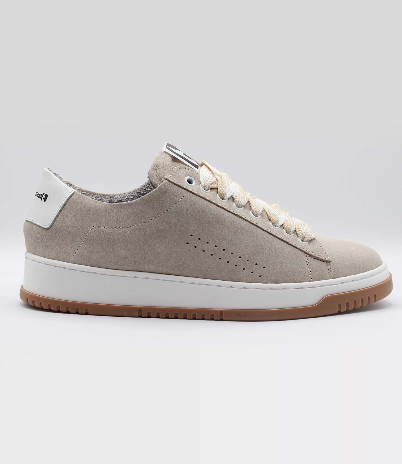 Sneakers in vera pelle. Tomaia in camoscio liscio colore sabbia con inserto in pelle bianca sullo spoiler, soletta anatomica e gomma bicolore morbida ultraleggera con laccio tecnico bicolore. L'intento in morbido cotone traspirante. Prodotto 100% made in Italy interamente fatte a mano dai nostri artigiani calzaturieri.